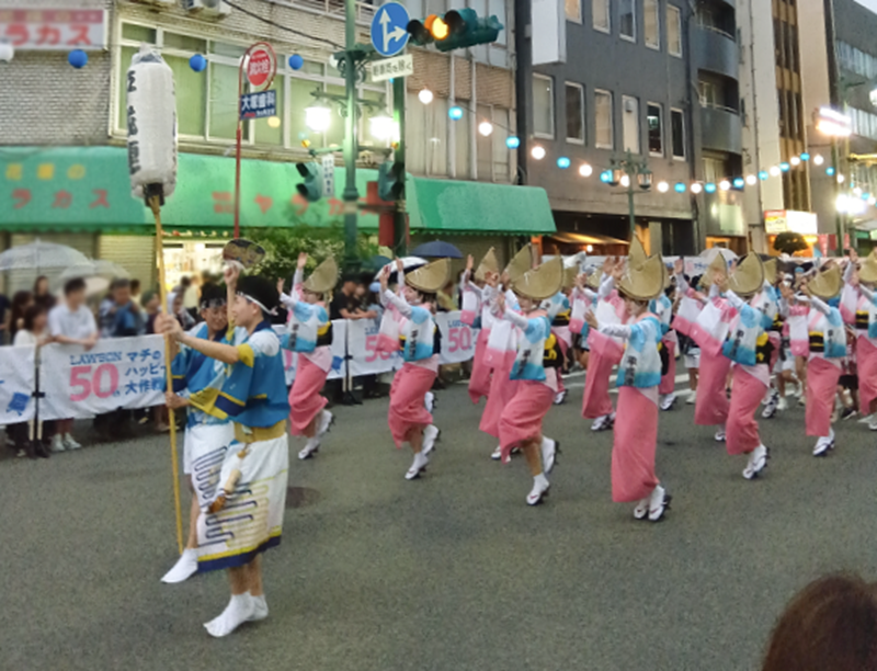 病院施設への訪問を終えた後、一行はバスで移動。最初に両国本町演舞場へ踊り込みました。「踊り子泣かせ」とも称される約 170 mにわたる演舞場。突然の大雨にもかかわらず沿道いっぱいに詰めかけた観客が見守る中、美しい群舞で踊り抜けました。