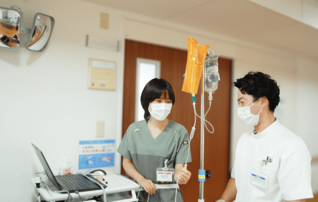 患者さんの健康管理として、バイタルサインの測定や食事・排泄・睡眠・服薬状況の観察を行っています。勤務開始後は、カルテや他の看護師から患者さんの状態、検査結果、治療計画を確認し、病室を回って朝のバイタルサインを測定します。その後、点滴の管理、注射の準備、薬の投与などを実施します。