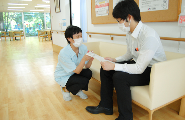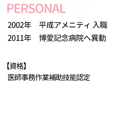 その後、体力面などから進路を再考し、医療事務の道へ。専門学校を卒業してから博愛記念病院に就職し、隣接する平成アメニティで受付事務を担当しました。電話対応や窓口での応対、介護保険のレセプト請求などを担う一方、入所者さんから声をかけていただくことも多く、傾聴を心がけていました。