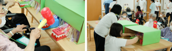 ボックスからワニが頭を出した瞬間、患者さんの手が一瞬の早業でハンマーを振り下ろします。その瞬発力に、職員からも思わず「おおっ!」と感嘆の声。