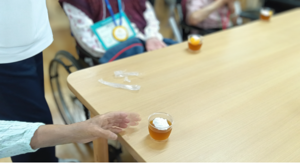 お祭りの締めくくりには、特製の「ほうじ茶ゼリー」をご用意しました。やさしい甘さのデザートです。意外性のある味に、「何の味?」とまるでクイズのように会話が広がります。ゼリーは嚥下力や食事制限に応じて個別に調整し、安心して召し上がっていただける工夫を凝らしています。