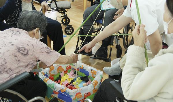釣り堀に見立てた子ども用プールに用意されたカラフルな金魚を、患者さんが竿で狙います。糸をたぐる手元に、自然と力が入っているのが伝わってきました。一方で、釣れたと思った金魚が途中で落ちてしまう場面も。釣り上げた金魚は器に移し、その成果を見ながら職員ともコミュニケーションが生まれて、場には穏やかな空気が広がっていました。