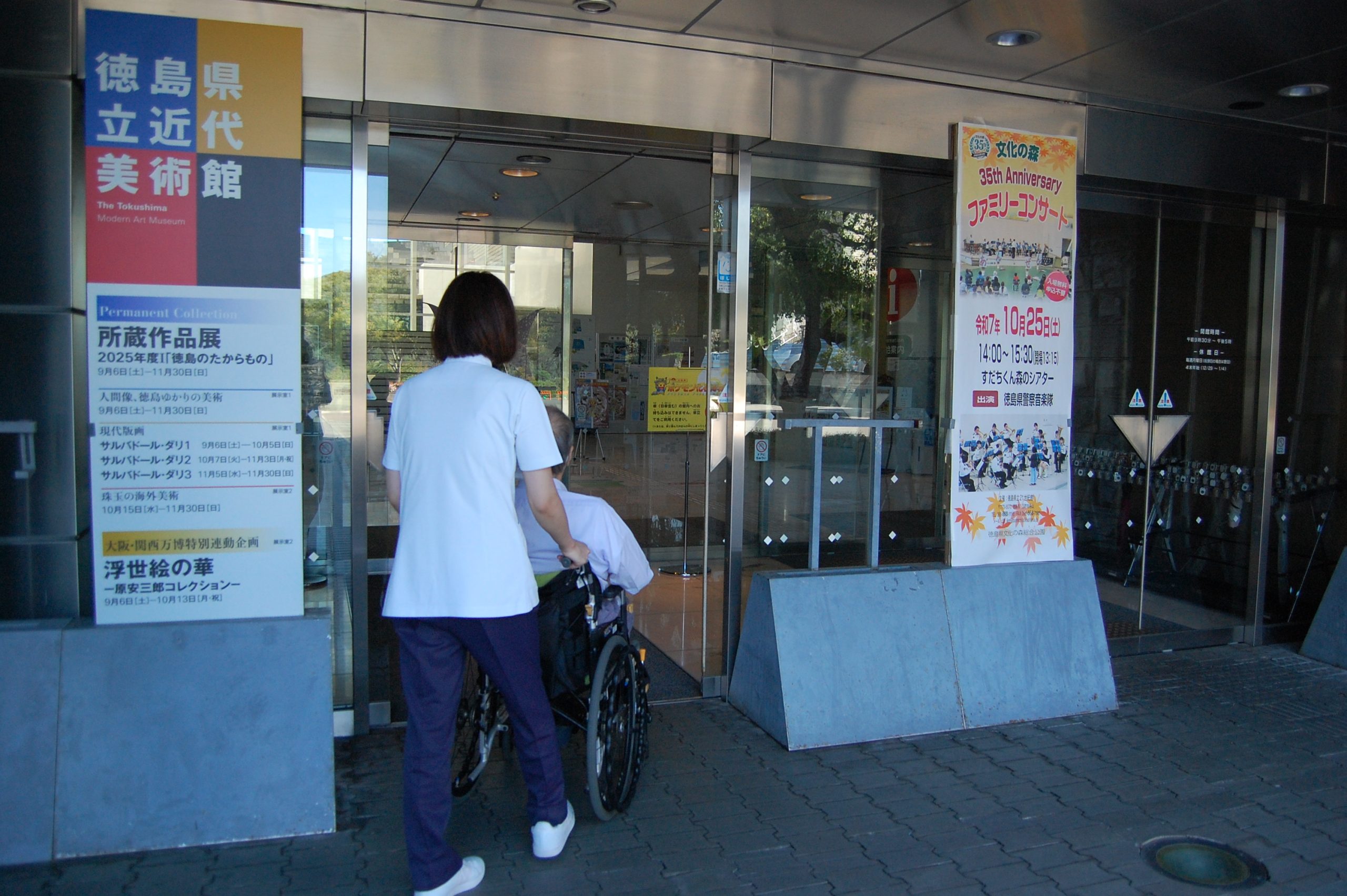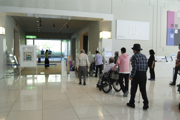当日はマイクロバス2台に分乗して出発。文化の森総合公園・近代美術館の最寄りの駐車スペースで安全に降車し、屋根付きの通路を通って館内へ。車いすでも移動しやすいバリアフリー設計で、エレベーターを利用してスムーズに展示室へ進むことができました。