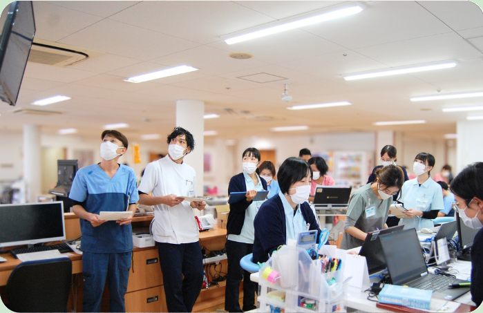 病棟カンファレンス。より質の高いケアを提供するために医師や看護師、リハビリスタッフ等と患者さんの情報を共有