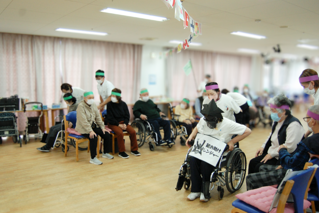 座位でも安全に参加できるよう、台車に乗せた紅白のカゴを職員が移動させる方式を採用。利用者さんの前までかごが「動いてくる」という、デイケアならではの工夫を加えた玉入れです。玉を拾って手渡す職員、周囲を見守る職員、かごを前へ進める職員等が連携しながら、転倒や過度な動作を防ぎながらサポートしました。
