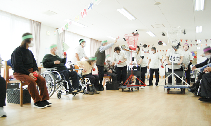 外れた玉を職員が拾って再チャレンジ。制限時間があるためかごは常に移動します。立位可能な方は上から「ダンクシュート」を決めるなど、個々の「できること」に合わせたスタイルで玉入れに参加しました。