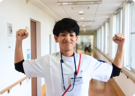 回復期リハビリテーション病棟でリハビリ、主任業務を行っています。楽しくリハビリをモットーに生活に必要な食事・更衣・排泄といった日常動作の獲得を目指した訓練に力を入れています。認知症のある方へのケアも重視し、安心して取り組める環境づくりを心がけています。