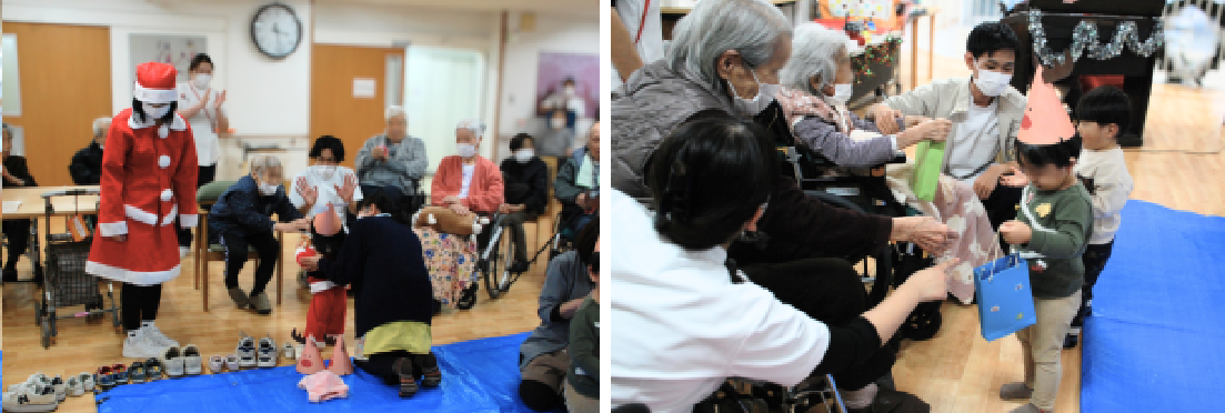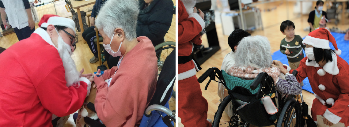 サンタクロースがマイクを手に患者さんに声をかけ、感想を聞く場面も。子どもたちに笑顔をわけてもらって、世代間交流の喜びがにじんでいました。1時間ほどのクリスマス会。名残を惜しみながらも手を振り合い、子どもたちを見送りました。