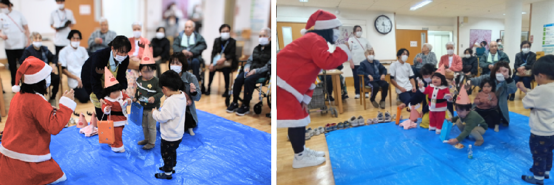 12月12日、地域包括ケア病棟に院内保育所の子どもたちを招いたクリスマス会を行いました。これは、入院中の患者さんが社会的な交流を通じて病室を離れる、「目的のある離床」を意識した取り組みの一環です。