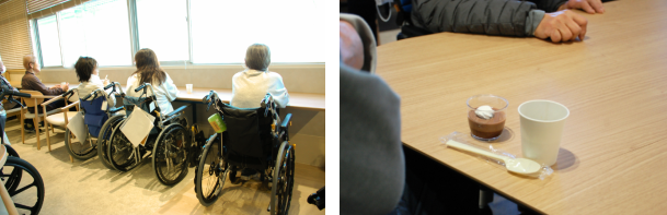 栄養科がこの日のために用意したのは、喫茶風に生クリームを添えたチョコプリンです。飲み物は、コーヒーやとろみ付けをしたお茶など、患者さんごとの状態や嗜好に合わせて内容を確認しながら提供しました。