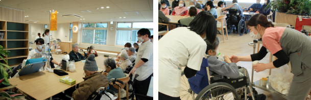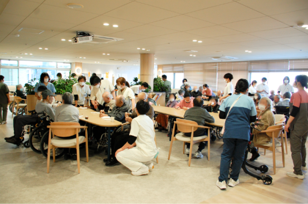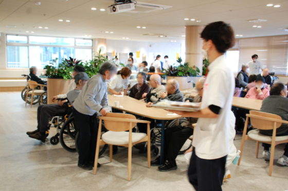 新しいホールは全体を見渡しやすく、車いすでテーブルにつく際も余裕があり、移動やトイレへの誘導もスムーズです。あたたかみのある空間のなかで会話も自然に広がり、患者さんや職員の声がほどよく溶け込んでいきました。