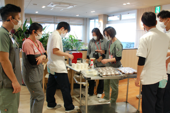 2月19日、回復期リハビリテーション病棟の患者食堂・懇談ホールで、バレンタインデイにちなんだ喫茶を開催しました。リニューアル後のホールで行う初の大規模イベントです。